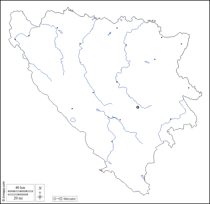 d-maps > यूरोप > बॉस्निया और हर्ज़ेगोविना > बाह्यरेखा, जल-सर्वेक्षण, मुख्य शहरों, सफेद