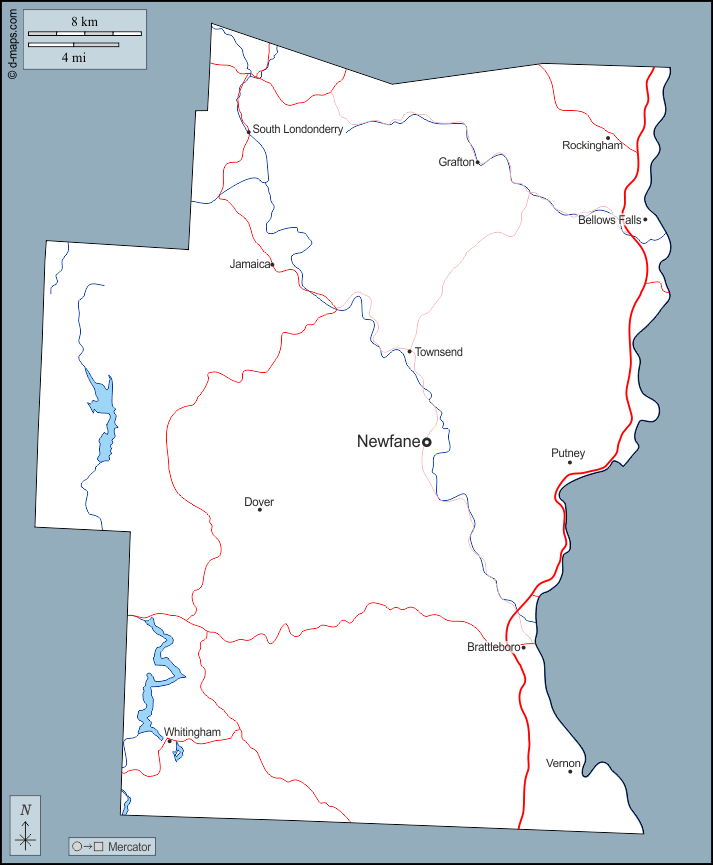 d-maps > संयुक्त राज्य > वरमोंट > विंडहैम काउंटी > बाह्यरेखा, जल-सर्वेक्षण, मुख्य शहरों, सड़कों, नाम