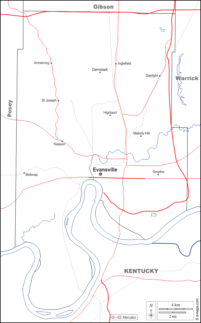 d-maps > संयुक्त राज्य > इंडियाना > वेंडरबॉर्ग काउंटी > सीमाओं, जल-सर्वेक्षण, पड़ोस, सड़कों, नाम, सफेद