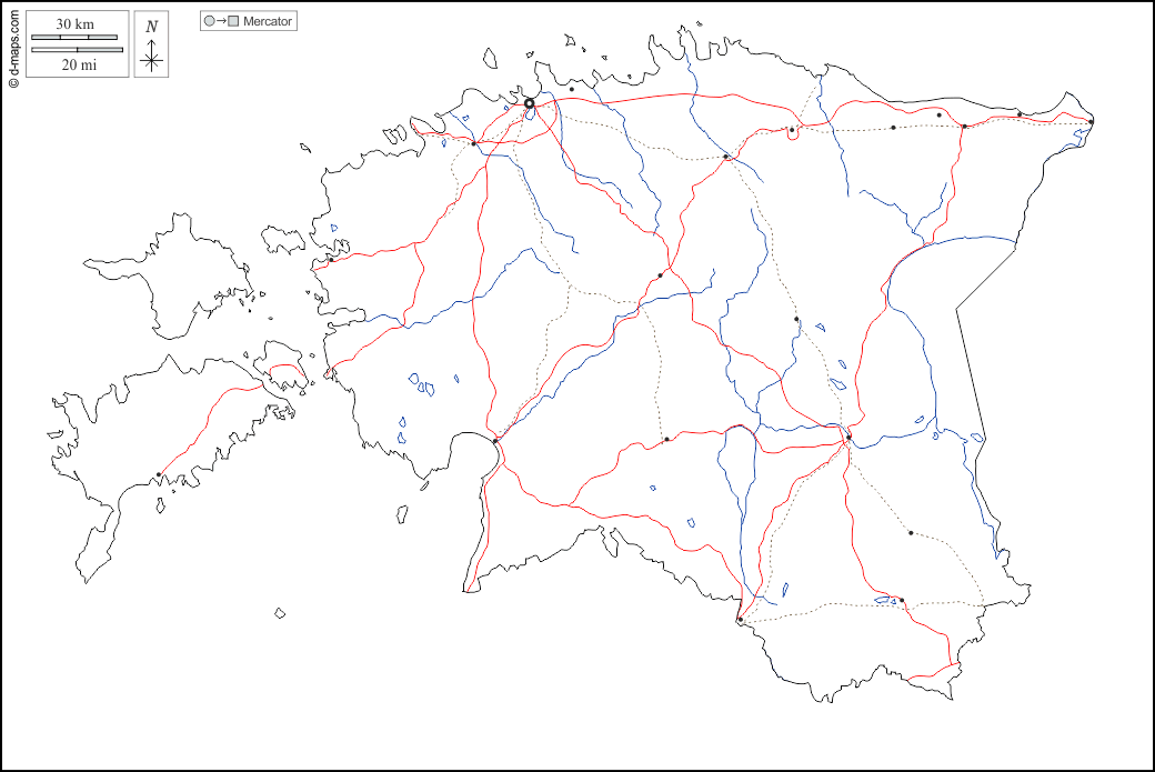 d-maps > यूरोप > एस्टोनिया > बाह्यरेखा, जल-सर्वेक्षण, मुख्य शहरों, सड़कों, सफेद