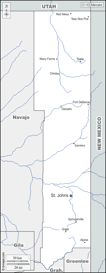 d-maps > संयुक्त राज्य > एरिजोना > अपाचे काउंटी > सीमाओं, जल-सर्वेक्षण, मुख्य शहरों, नाम