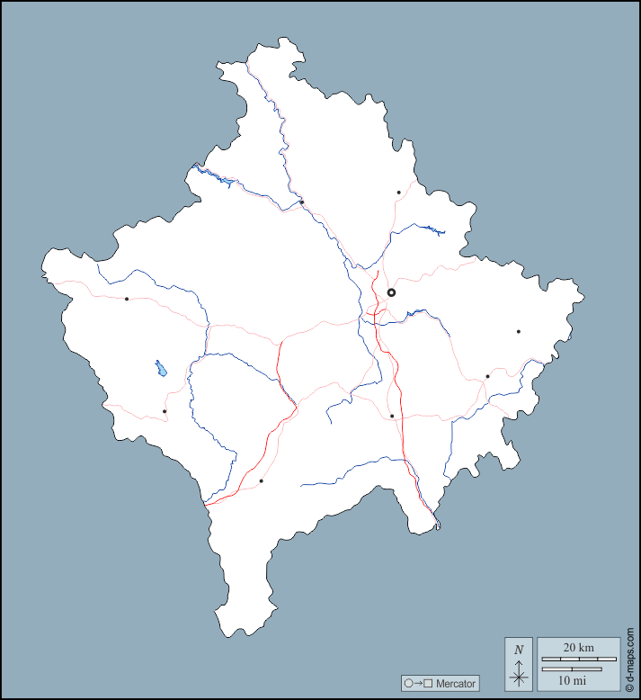 d-maps > यूरोप > कोसोवो गणराज्य > बाह्यरेखा, जल-सर्वेक्षण, मुख्य शहरों, सड़कों