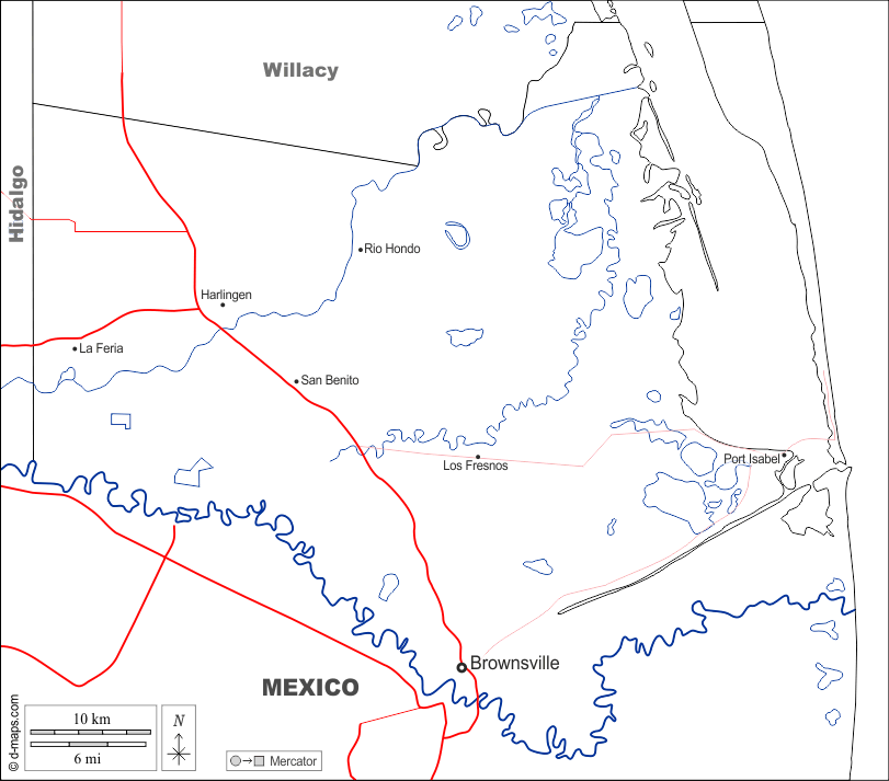 d-maps > संयुक्त राज्य > टेक्सास > कैमरून काउंटी > सीमाओं, जल-सर्वेक्षण, मुख्य शहरों, सड़कों, नाम, सफेद
