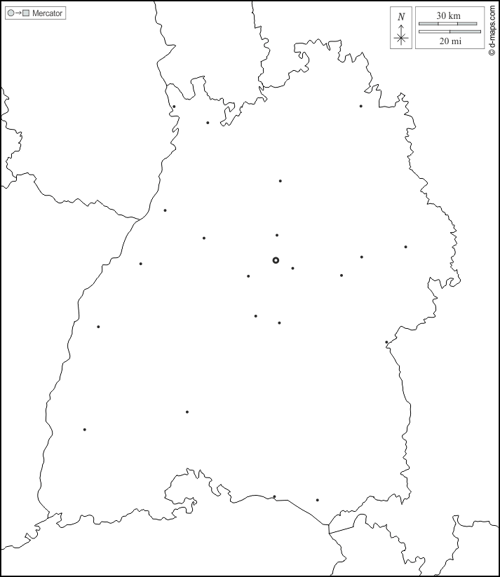 d-maps > यूरोप > जर्मनी > बाडेन-वुर्टेमबर्ग राज्य > सीमाओं, मुख्य शहरों, सफेद