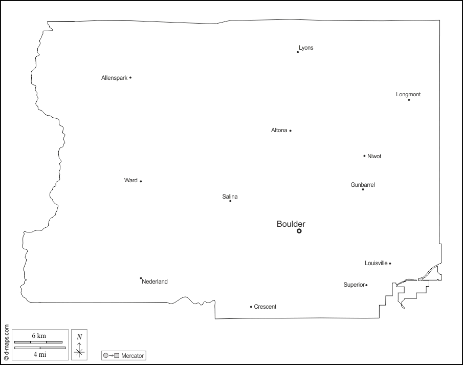 d-maps > संयुक्त राज्य > कोलोराडो > बोल्डर काउंटी > बाह्यरेखा, मुख्य शहरों, नाम, सफेद