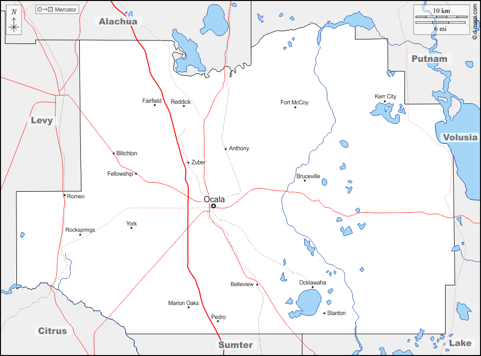 d-maps > संयुक्त राज्य > फ्लोरिडा > मैरियन काउंटी > सीमाओं, जल-सर्वेक्षण, मुख्य शहरों, सड़कों, नाम