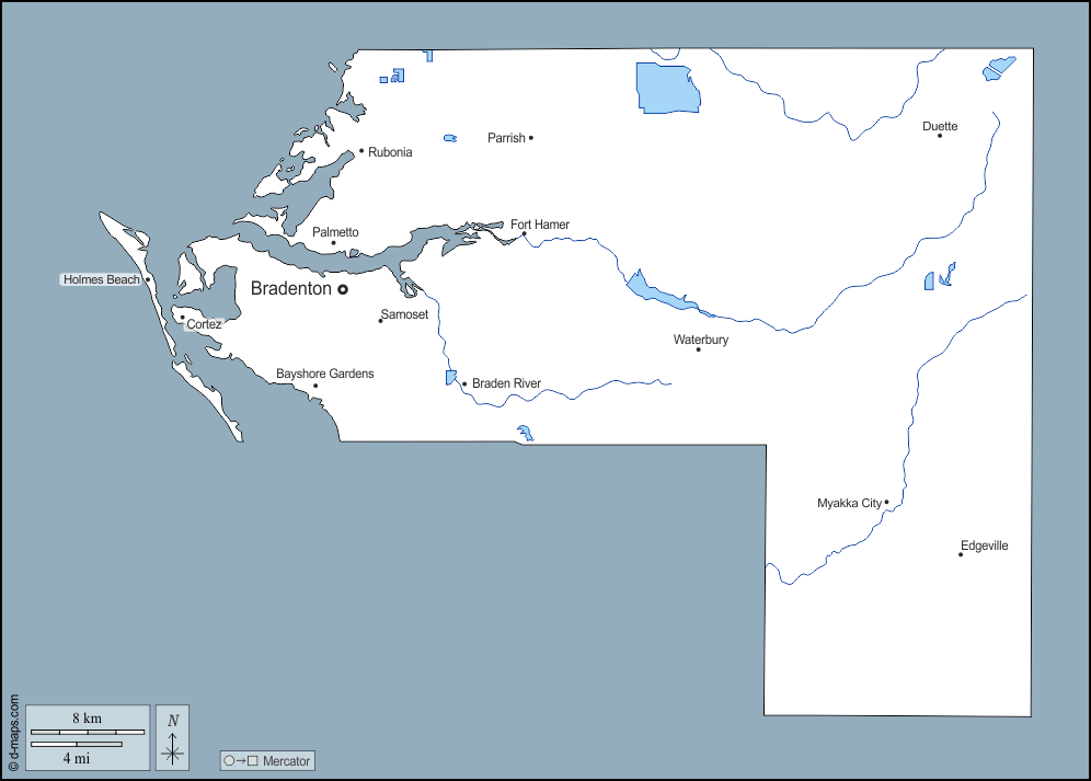 d-maps > संयुक्त राज्य > फ्लोरिडा > मानेटे काउंटी > बाह्यरेखा, जल-सर्वेक्षण, मुख्य शहरों, नाम