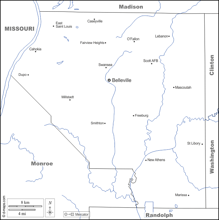 d-maps > संयुक्त राज्य > इलिनॉय > सैंट क्लैर काउंटी > सीमाओं, जल-सर्वेक्षण, मुख्य शहरों, नाम, सफेद