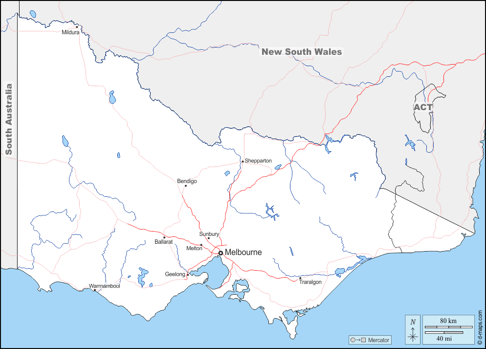 d-maps > ओशिनिया > विक्टोरिया > सीमाओं, जल-सर्वेक्षण, मुख्य शहरों, सड़कों, नाम