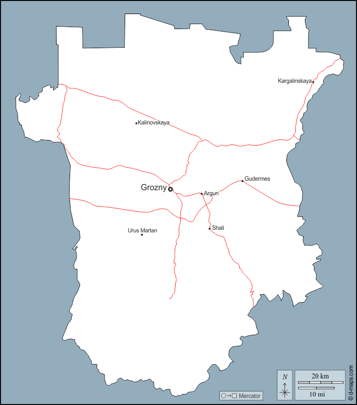 d-maps > यूरोप > रूस > चेचन्या > बाह्यरेखा, मुख्य शहरों, सड़कों, नाम