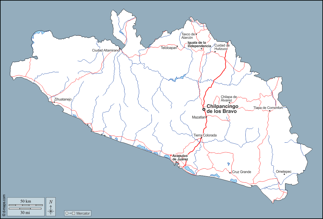 d-maps > महाअमेरिका > मेक्सिको > ग्वेरेरो > बाह्यरेखा, जल-सर्वेक्षण, मुख्य शहरों, सड़कों, नाम