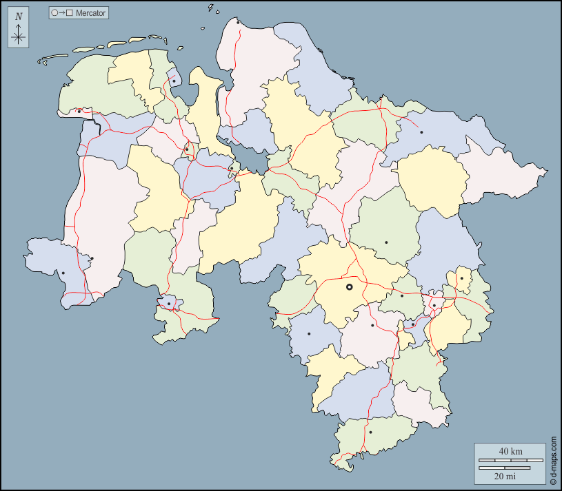 d-maps > यूरोप > जर्मनी > लोअर सैक्सोनी राज्य > बाह्यरेखा, जिलों, मुख्य शहरों, सड़कों, रंग