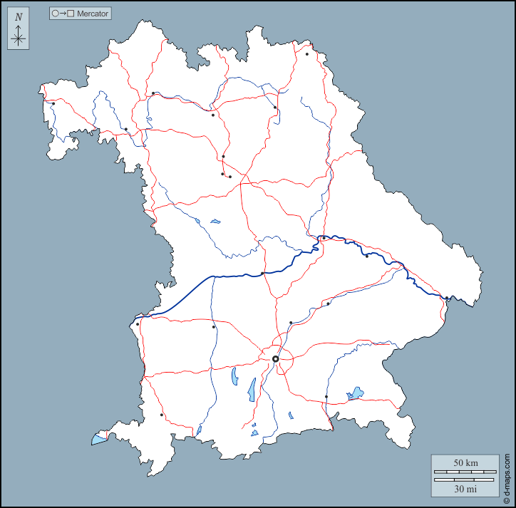 d-maps > यूरोप > जर्मनी > बवेरिया का स्वतंत्र राज्य > बाह्यरेखा, जल-सर्वेक्षण, मुख्य शहरों, सड़कों