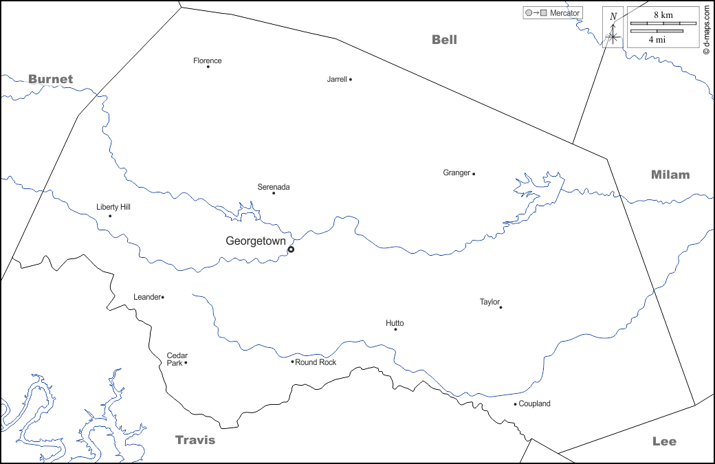 d-maps > संयुक्त राज्य > टेक्सास > विलियमसन काउंटी > सीमाओं, जल-सर्वेक्षण, मुख्य शहरों, नाम, सफेद