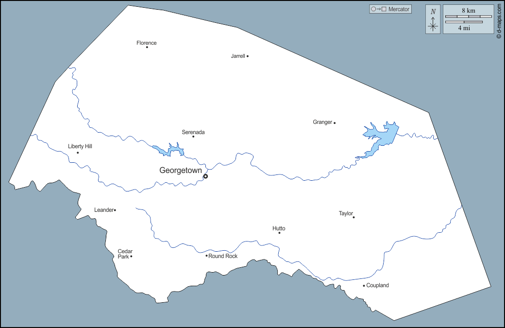 d-maps > संयुक्त राज्य > टेक्सास > विलियमसन काउंटी > बाह्यरेखा, जल-सर्वेक्षण, मुख्य शहरों, नाम