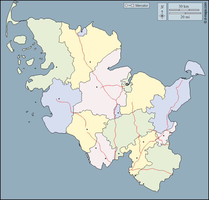 d-maps > यूरोप > जर्मनी > श्लेस्विग-होल्स्टीन राज्य > बाह्यरेखा, जिलों, मुख्य शहरों, सड़कों, रंग