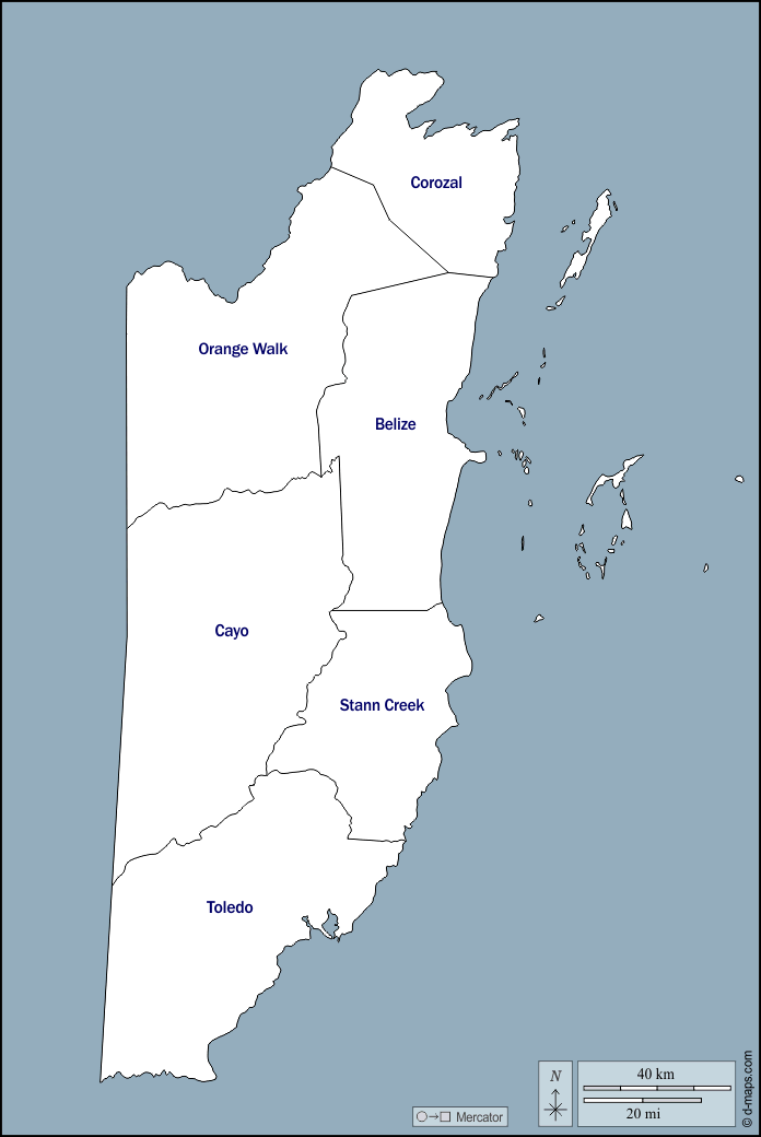 d-maps > महाअमेरिका > बेलीज़ > बाह्यरेखा, जिलों, नाम