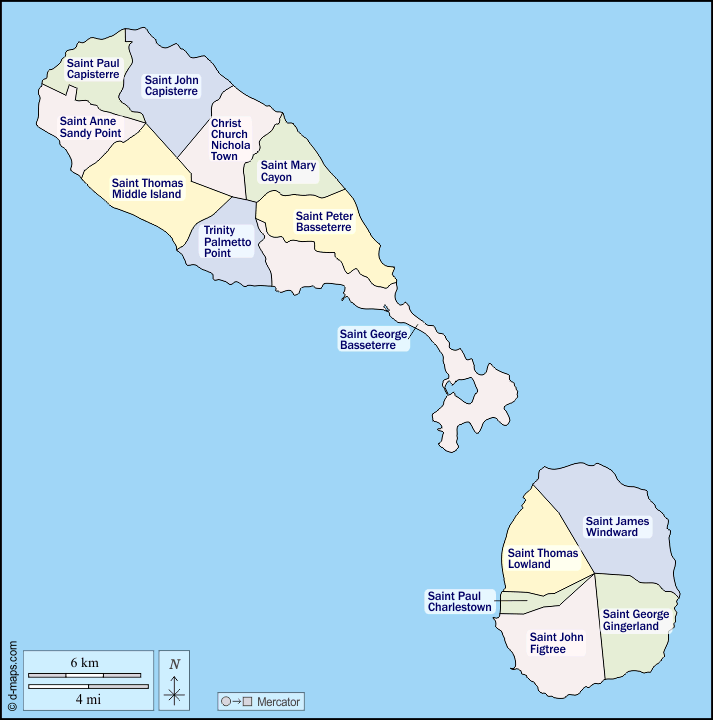 d-maps > महाअमेरिका > सेंट किट्स और नेविस > तटों, पारिशों, नाम, रंग