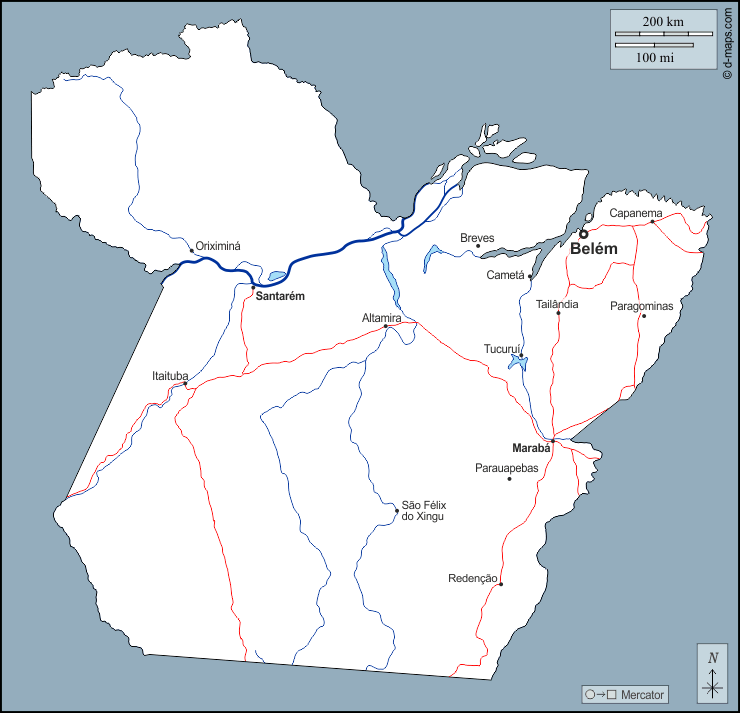d-maps > महाअमेरिका > ब्राज़ील > पारा राज्य > बाह्यरेखा, जल-सर्वेक्षण, मुख्य शहरों, सड़कों, नाम
