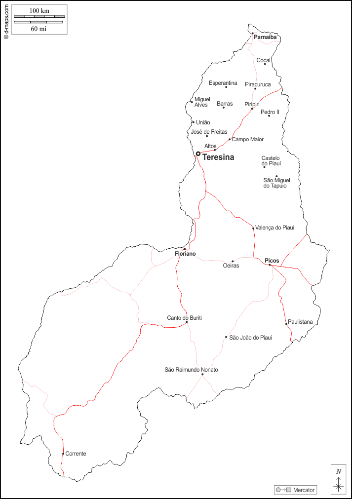 d-maps > महाअमेरिका > ब्राज़ील > पियाउई राज्य > बाह्यरेखा, मुख्य शहरों, सड़कों, नाम, सफेद