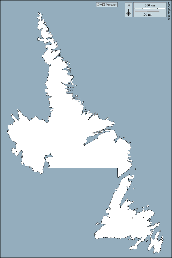 d-maps > महाअमेरिका > कनाडा > न्यूफ़ाउंडलैंड और लैब्राडोर > बाह्यरेखा, मुख्य शहरों