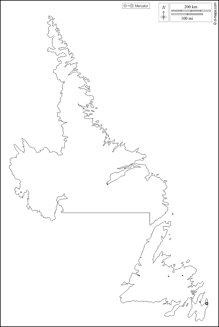 d-maps > महाअमेरिका > कनाडा > न्यूफ़ाउंडलैंड और लैब्राडोर > बाह्यरेखा, मुख्य शहरों, सफेद