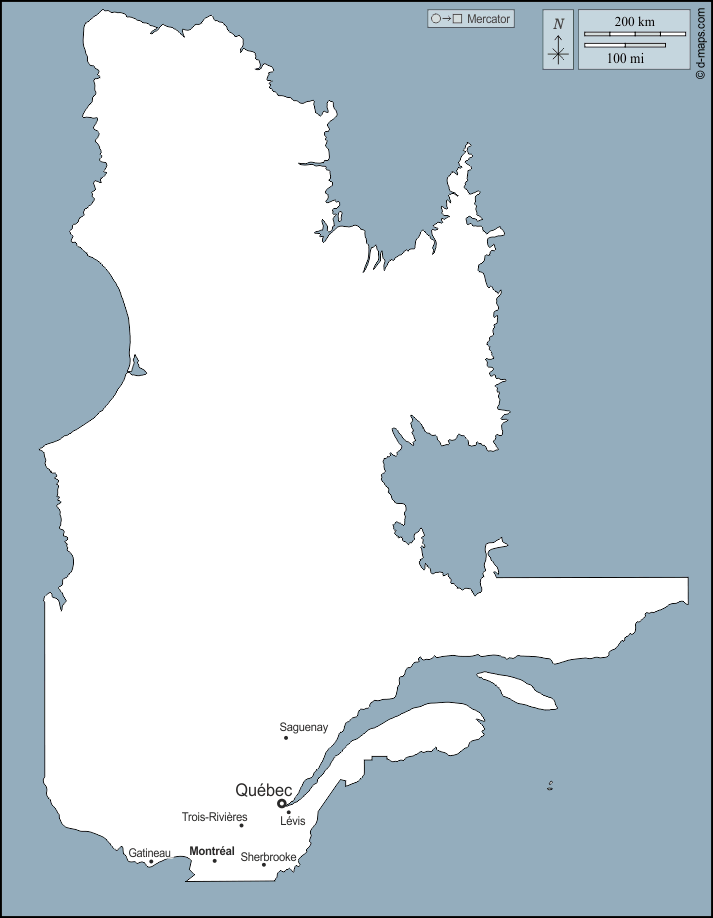 d-maps > महाअमेरिका > कनाडा > क्यूबेक > बाह्यरेखा, मुख्य शहरों, नाम