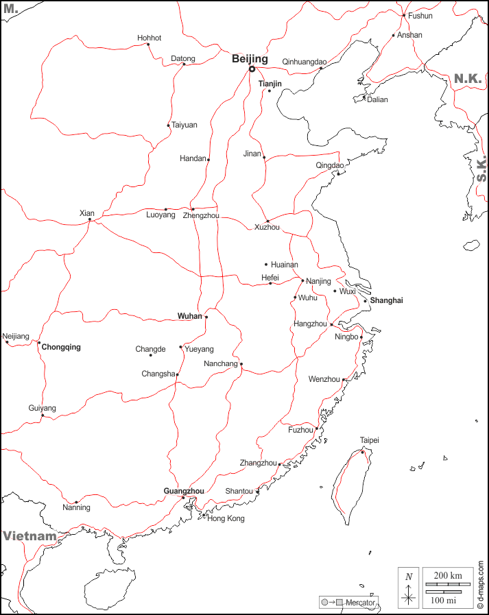 d-maps > एशिया > चीनी जनवादी गणराज्य > पूर्वी चीन > सीमाओं, मुख्य शहरों, सड़कों, नाम, सफेद