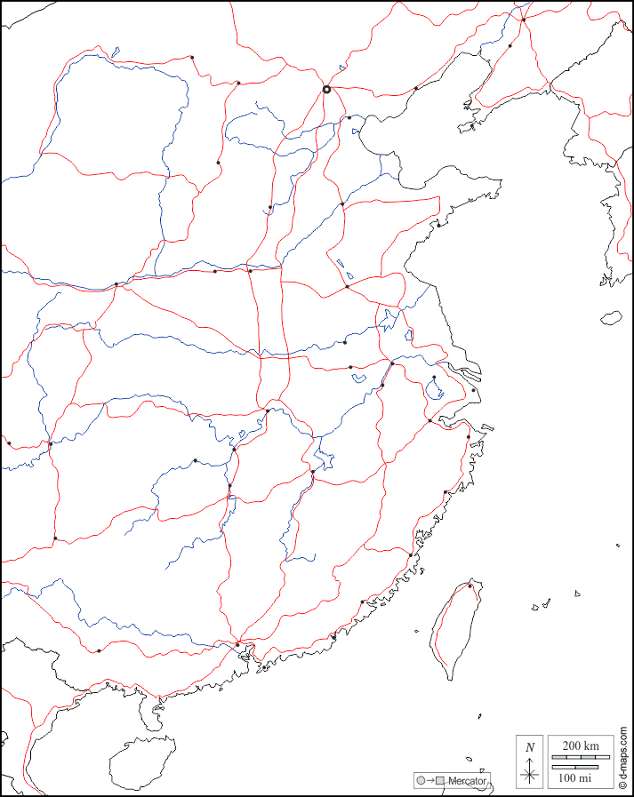 d-maps > एशिया > चीनी जनवादी गणराज्य > पूर्वी चीन > सीमाओं, जल-सर्वेक्षण, मुख्य शहरों, सड़कों, सफेद