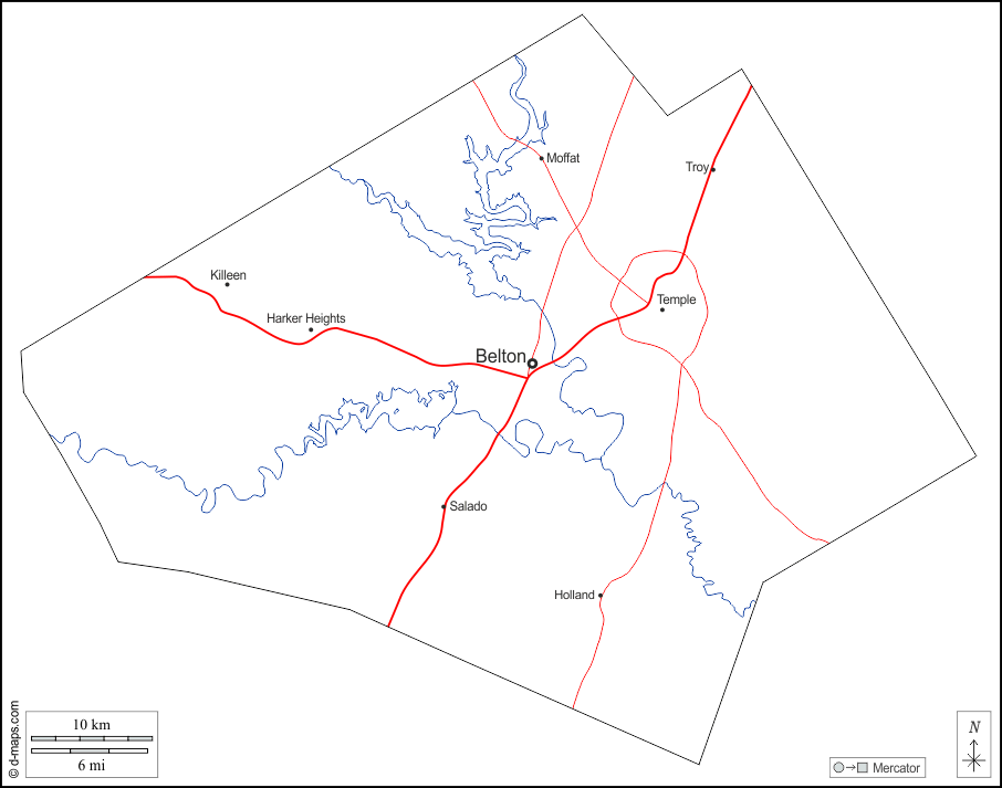 d-maps > संयुक्त राज्य > टेक्सास > बेल काउंटी > बाह्यरेखा, जल-सर्वेक्षण, मुख्य शहरों, सड़कों, नाम, सफेद
