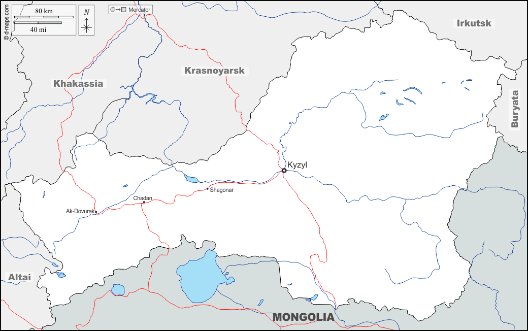 d-maps > यूरोप > रूस > तूवा > सीमाओं, जल-सर्वेक्षण, मुख्य शहरों, सड़कों, नाम