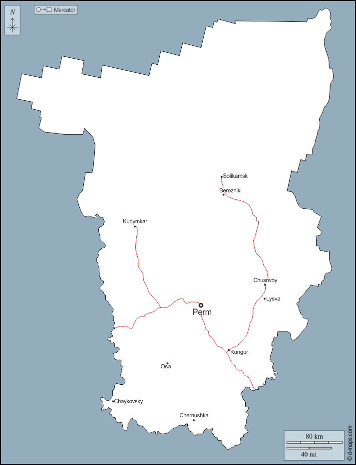 d-maps > यूरोप > रूस > पेर्म क्राय > बाह्यरेखा, मुख्य शहरों, सड़कों, नाम
