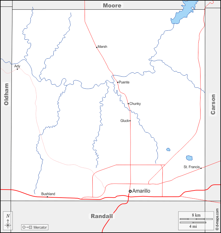 d-maps > संयुक्त राज्य > टेक्सास > पॉटर काउंटी > सीमाओं, जल-सर्वेक्षण, मुख्य शहरों, सड़कों, नाम