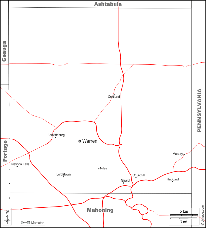 d-maps > संयुक्त राज्य > ओहायो > ट्रंबुल काउंटी > सीमाओं, मुख्य शहरों, सड़कों, नाम, सफेद