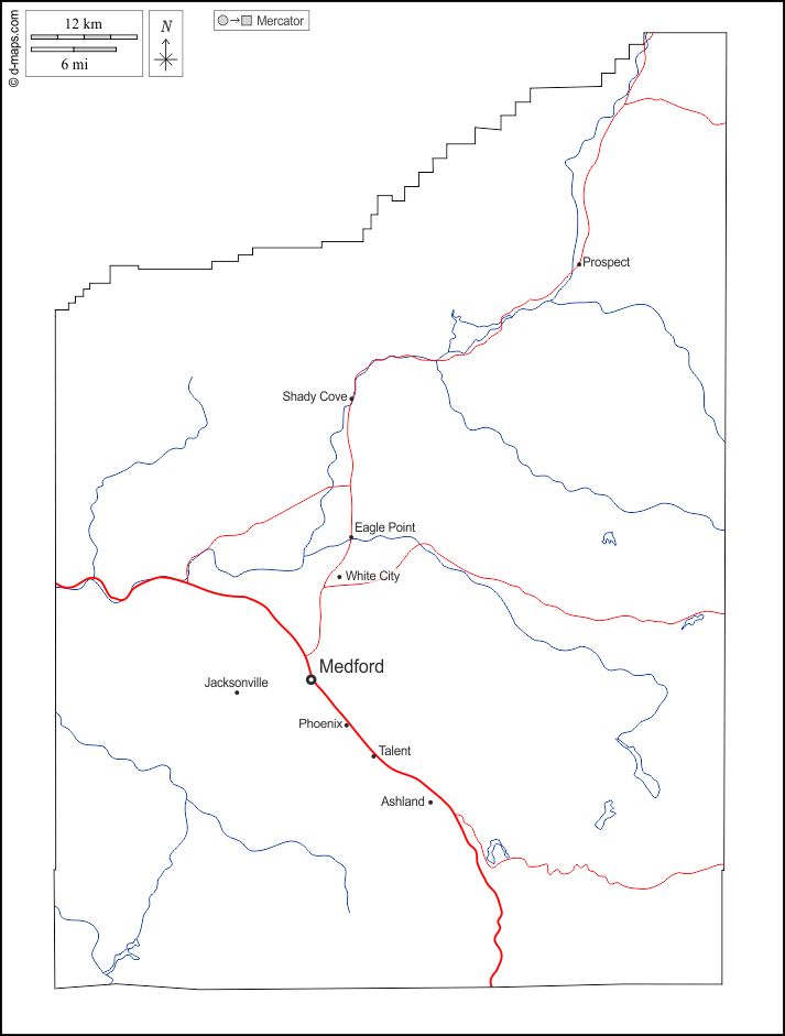 d-maps > संयुक्त राज्य > औरिगन > जैक्सन काउंटी > बाह्यरेखा, जल-सर्वेक्षण, मुख्य शहरों, सड़कों, नाम, सफेद