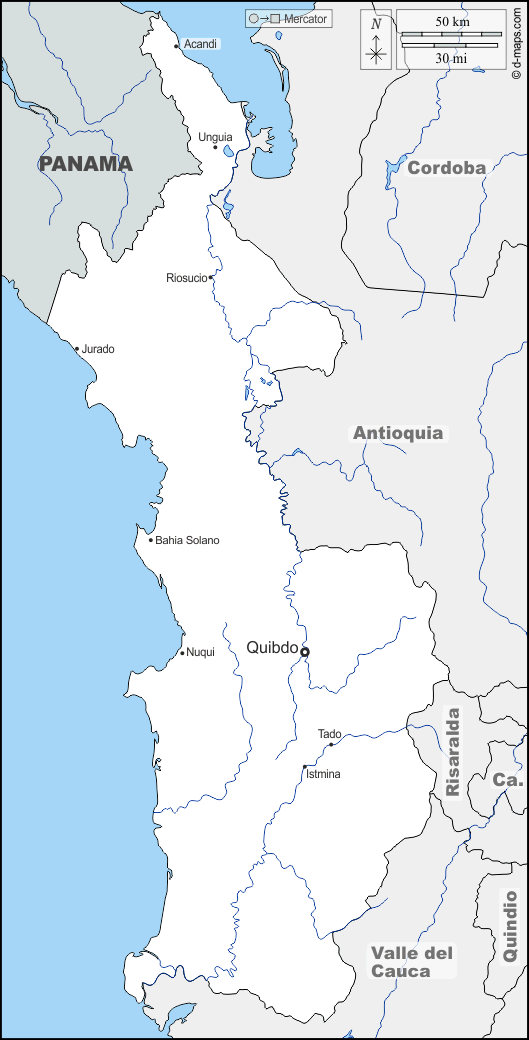 d-maps > महाअमेरिका > कोलंबिया > चोको विभाग > सीमाओं, जल-सर्वेक्षण, मुख्य शहरों, नाम