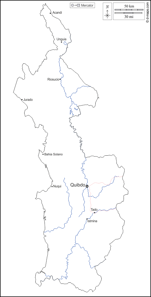 d-maps > महाअमेरिका > कोलंबिया > चोको विभाग > बाह्यरेखा, जल-सर्वेक्षण, मुख्य शहरों, सड़कों, नाम, सफेद