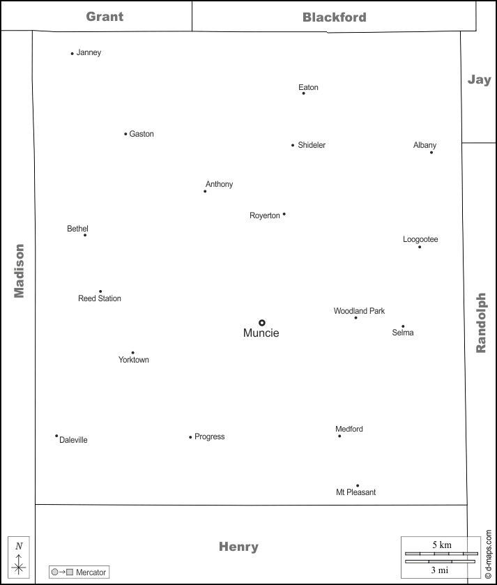 d-maps > संयुक्त राज्य > इंडियाना > डेलावेर काउंटी > सीमाओं, मुख्य शहरों, नाम, सफेद