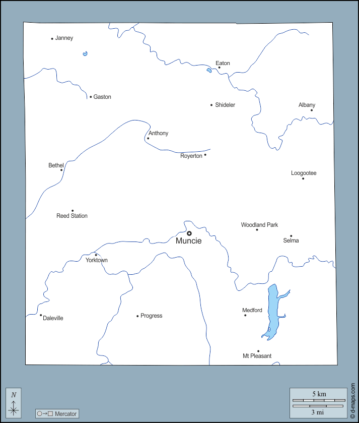 d-maps > संयुक्त राज्य > इंडियाना > डेलावेर काउंटी > बाह्यरेखा, जल-सर्वेक्षण, मुख्य शहरों, नाम