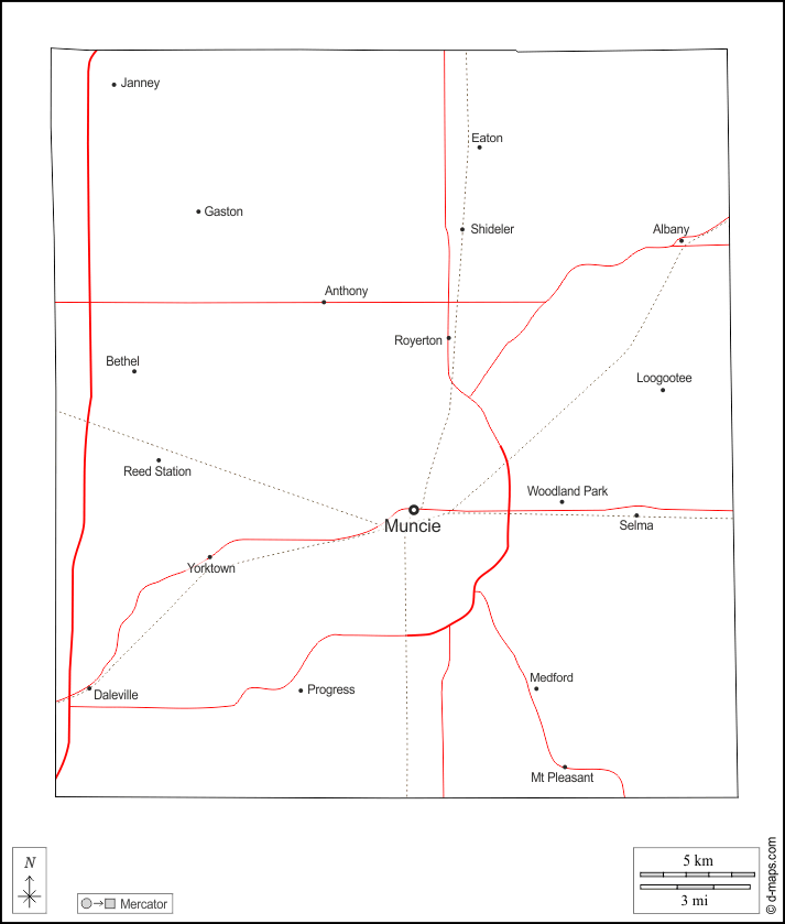 d-maps > संयुक्त राज्य > इंडियाना > डेलावेर काउंटी > बाह्यरेखा, मुख्य शहरों, सड़कों, नाम, सफेद