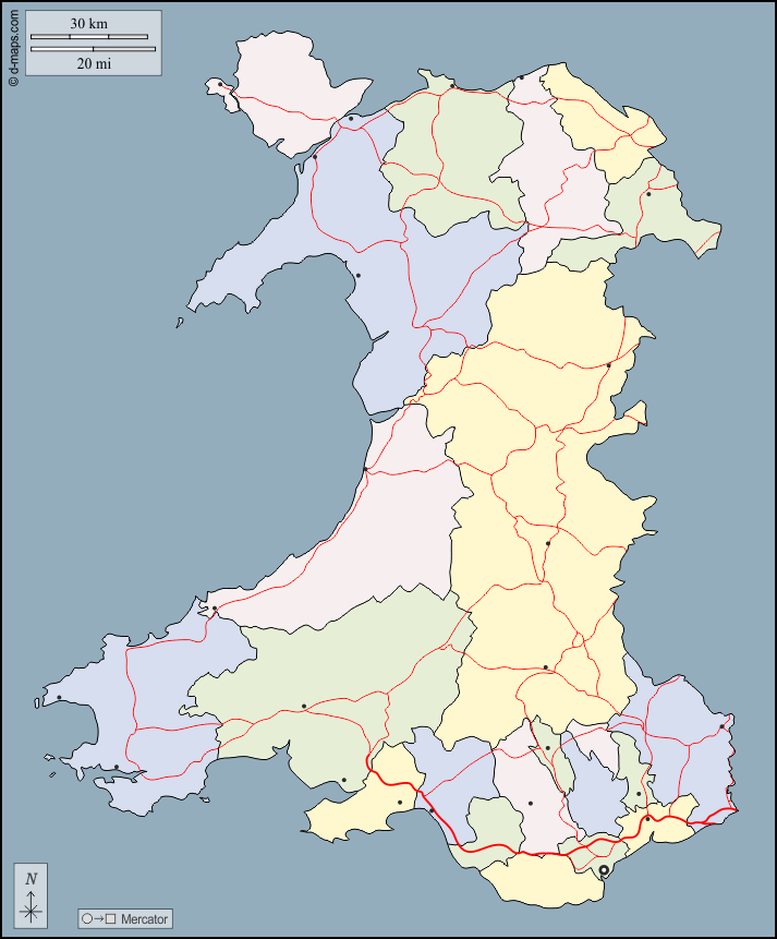 d-maps > यूरोप > युनाइटेड किंगडम > वेल्स > बाह्यरेखा, क्षेत्र, मुख्य शहरों, सड़कों, रंग