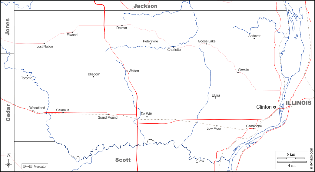 d-maps > संयुक्त राज्य > आयोवा > क्लिंटन काउंटी > सीमाओं, जल-सर्वेक्षण, मुख्य शहरों, सड़कों, नाम, सफेद