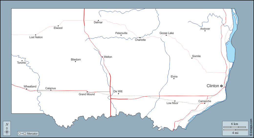 d-maps > संयुक्त राज्य > आयोवा > क्लिंटन काउंटी > बाह्यरेखा, जल-सर्वेक्षण, मुख्य शहरों, सड़कों, नाम