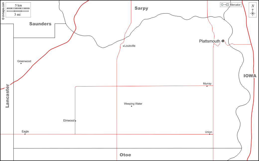 d-maps > संयुक्त राज्य > नेब्रास्का > कैस काउंटी > सीमाओं, मुख्य शहरों, सड़कों, नाम, सफेद