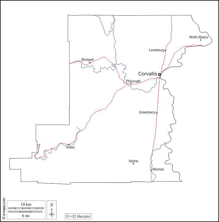 d-maps > संयुक्त राज्य > औरिगन > बेंटन काउंटी > बाह्यरेखा, जल-सर्वेक्षण, मुख्य शहरों, सड़कों, नाम, सफेद
