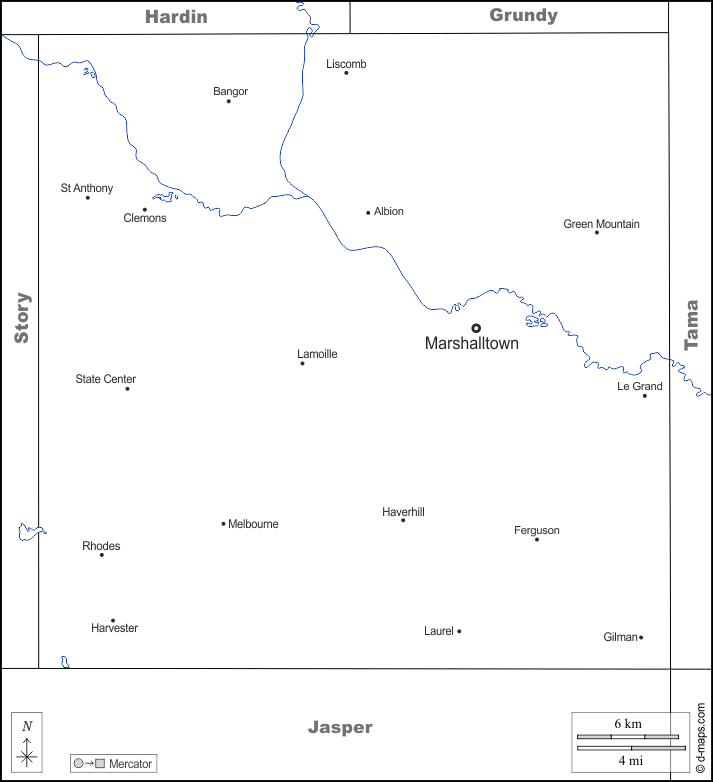 d-maps > संयुक्त राज्य > आयोवा > मार्शल काउंटी > सीमाओं, जल-सर्वेक्षण, मुख्य शहरों, नाम, सफेद