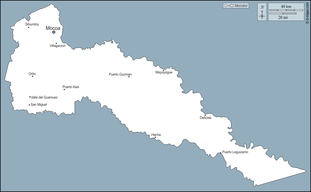 d-maps > महाअमेरिका > कोलंबिया > पुटुमायो विभाग > बाह्यरेखा, मुख्य शहरों, नाम