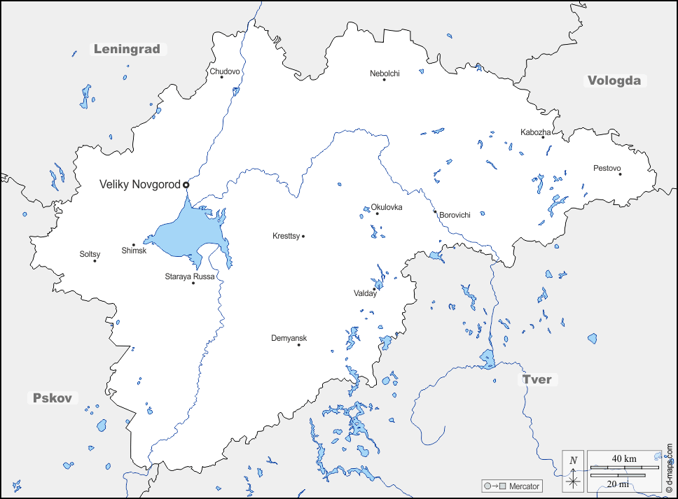 d-maps > यूरोप > रूस > नोव्गोरोड > सीमाओं, जल-सर्वेक्षण, मुख्य शहरों, नाम