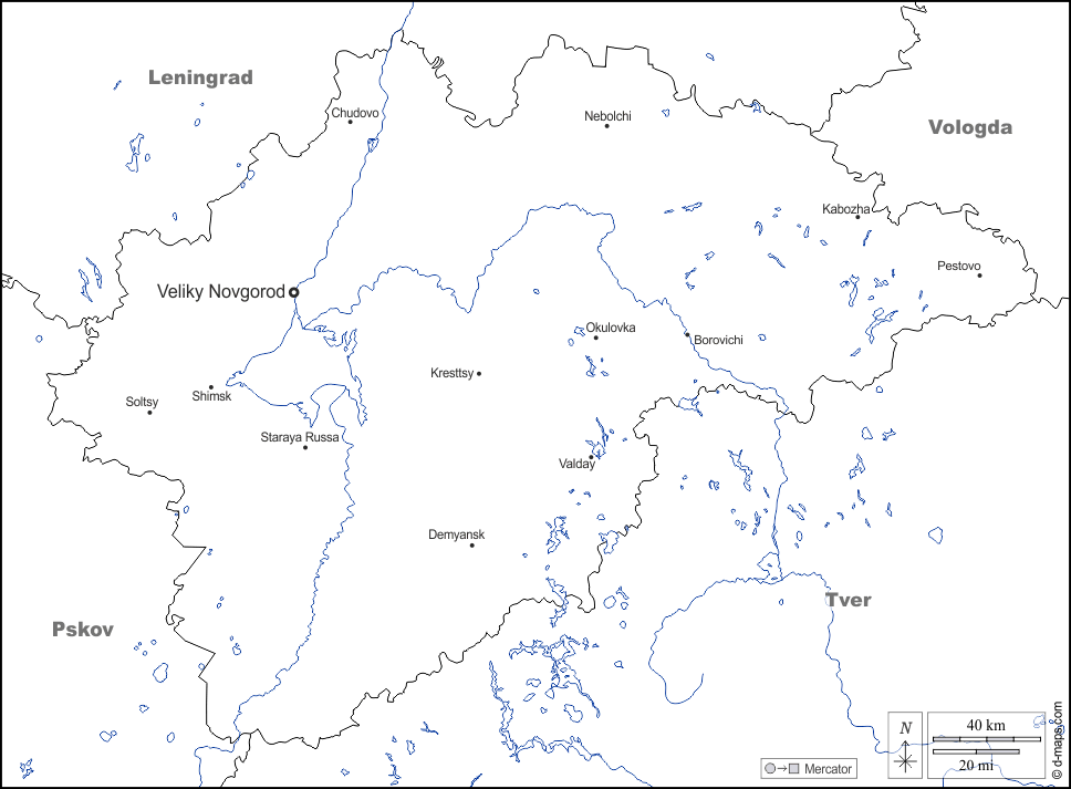d-maps > यूरोप > रूस > नोव्गोरोड > सीमाओं, जल-सर्वेक्षण, मुख्य शहरों, नाम, सफेद