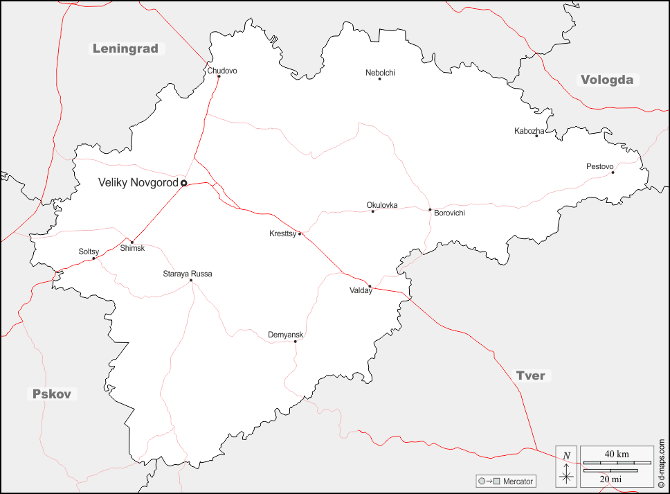 d-maps > यूरोप > रूस > नोव्गोरोड > सीमाओं, मुख्य शहरों, सड़कों, नाम